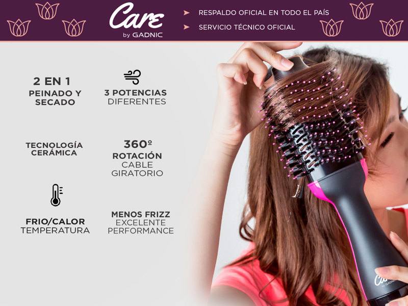 ¡GADNIC Care presenta su nueva línea de productos de peluquería profesional! Dentro de esta línea, destacamos el innovador secador-cepillo de pelo, que incorpora tecnología cerámica y de iones negativos, convirtiéndolo en uno de los más versátiles y modernos del mercado. Este producto es ideal tanto para uso profesional como domiciliario, y cuenta con un gancho de sujeción y un cable giratorio de 360 grados para mayor comodidad. Además el nuevo cepillo de silicona, diseñado específicamente para el cuidado del cabello. Este cepillo es perfecto para masajear el cuero cabelludo, promoviendo la circulación sanguínea y aliviando la fatiga, el estrés y la picazón. Ideal para usar en casa, en la oficina o durante tus viajes. Especificaciones Cepillo Secador de Pelo Care By Gadnic S1200 Pro Voluminizador Frío Calor