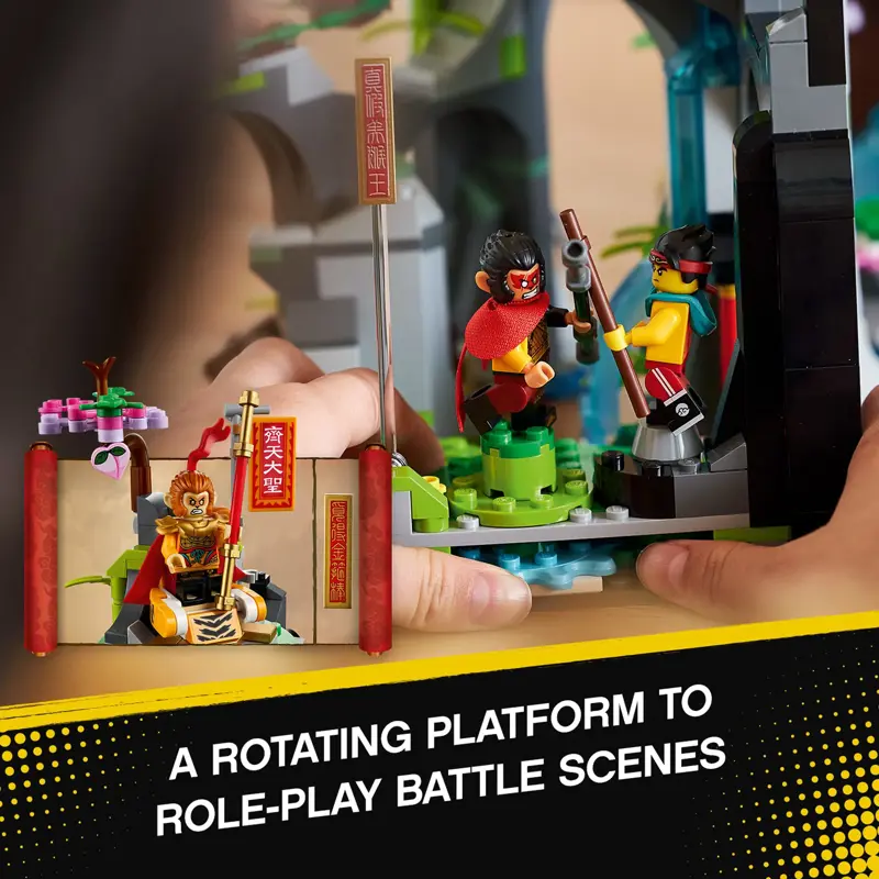 - Repleto de características auténticas de narración, incluyendo una roca de apertura para revelar el Rey Mono, una cascada para construir que se abre para permitir la entrada a la montaña y una grúa de corona roja para construir.