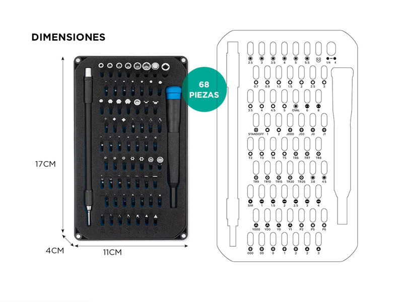 Este kit es ideal para quienes buscan un set herramientas versátil y completo, 68 piezas especialmente diseñadas para la reparación y mantención de dispositivos electrónicos