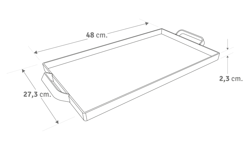 Mide 48 x 27,3 cm y 2,3 cm de alto. Ocupa dos hornallas. Su espesor es de 2,5 mm. Ideal para que ser manipulada con facilidad.