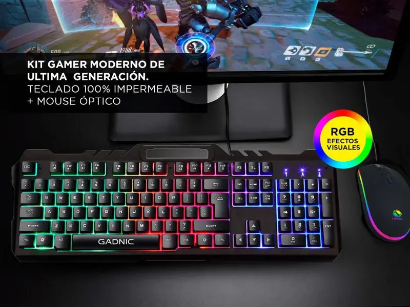 KIT GAMER Moderno de ultima generación con Teclado 100% impermeable para mayor proteccion, retro Iluminacion Rainbow y teclas ergonomicas. Incluye Mouse de 2400dpi de alta precision que otorgará una grán experiencia al momento de jugar.