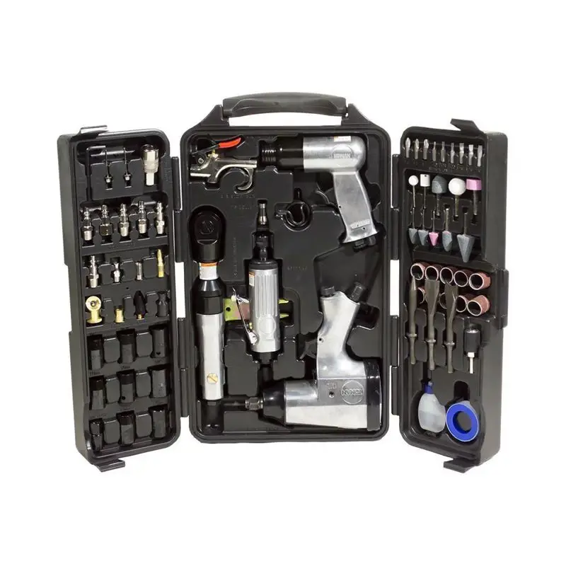KONANMODELO KKI/03Kit Herramientas Neumáticas Profesional- 71 PIEZAS· 1 Llave De Impacto de 1/2”· 1 Martillo Neumatico de 150Mm· 1 Minitorno Neumatico de 1/4”· 1 Llave Crique Neumatica de 1/2”+ 68 Piezas y Accesorios