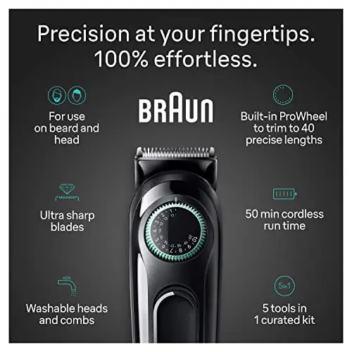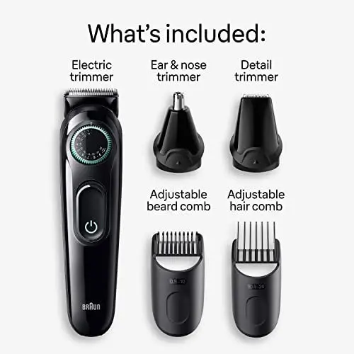 Kit todo en uno Braun Series 3. Para una mayor versatilidad y precisión en el hogar. Incluye un recortador de barba, orejas y nariz y un cortapelos. Cuenta con una rueda de precisión con 40 ajustes de longitud y cuchillas ultra afiladas. Tiempo de funcionamiento inalámbrico de 50 minutos. Incluye: cabezal recortador de plástico, peines de precisión para barba (0,5 mm — 10 mm) y pelo (10,5 — 20 mm), cabezal recortador de orejas y nariz y cabezal recortador de detalles. Contenido del envío: 1 dispositivo recortador con cabezal de plástico, 1 peine para barba Precision (0,5 mm — 10 mm), 1 peine Precision (10,5 — 20 mm), 1 cabezal recortador de orejas y nariz, 1 cabezal recortador de detalles y 1 cepillo de limpieza