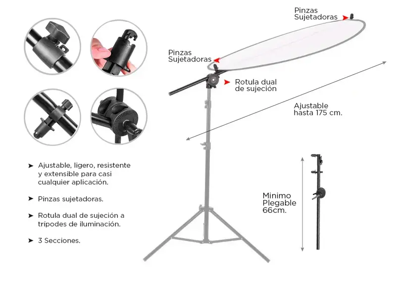 El soporte para pantallas reflectoras viene comprendido de un brazo telescópico con pinzas sujetadoras y una rotula dual de sujeción a trípodes de iluminación. El conjunto le brinda un sostén para pantallas reflectoras o fondos y le permite colocarlas exactamente donde lo necesita.