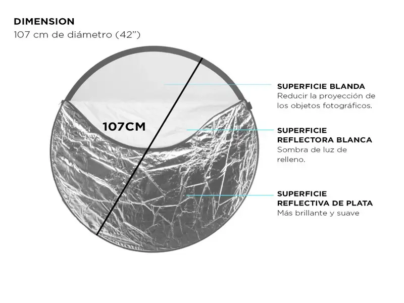 Lográ fotografías profesionales, con la versatilidad que te ofrece el reflector 5 en 1 de 1070cm, sacá provecho del gran manejo de luz y sombras con sus 5 superficies: Oro, Plata, Blanco, Negro y Translúcido.