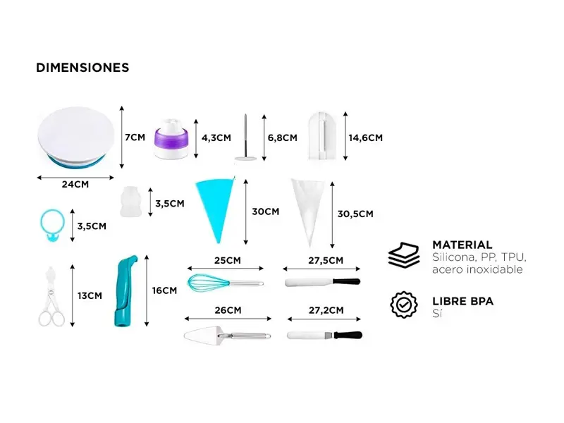 Fabricado con materiales duraderos como silicona, PP, TPU y acero inoxidable 430, nuestro kit garantiza resistencia y calidad en cada pieza. Cada herramienta está diseñada pensando en la comodidad y la facilidad de uso, lo que te permite disfrutar al máximo de tu experiencia en la cocina.