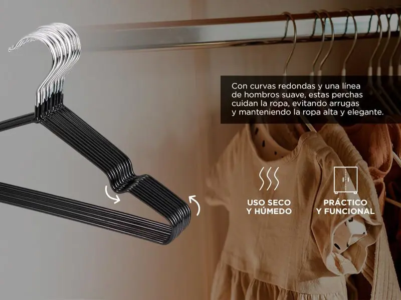 Envueltas en plástico antideslizante, estas perchas son eficaces para evitar que la ropa se resbale, ofreciendo tranquilidad al organizar prendas delicadas. Su diseño versátil permite su uso tanto en entornos húmedos como secos, lo que las hace ideales para secar varias prendas al mismo tiempo.