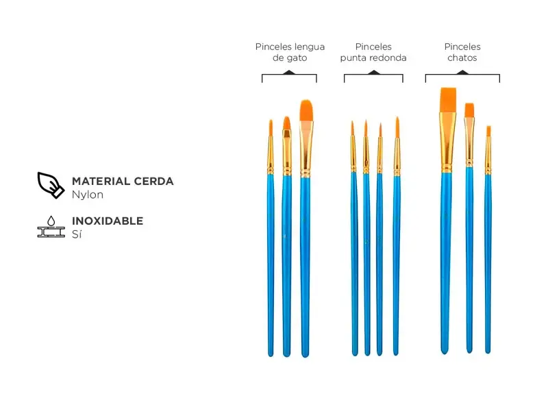 Este kit incluye pinceles en diversas formas y tamaños, perfectos para lograr diferentes efectos en tus pinturas, desde líneas finas hasta trazos gruesos y mezclas sutiles de color. Además, cada pincel está diseñado para ofrecer un agarre cómodo y ergonómico, permitiéndote pintar durante horas sin fatiga en tus manos.