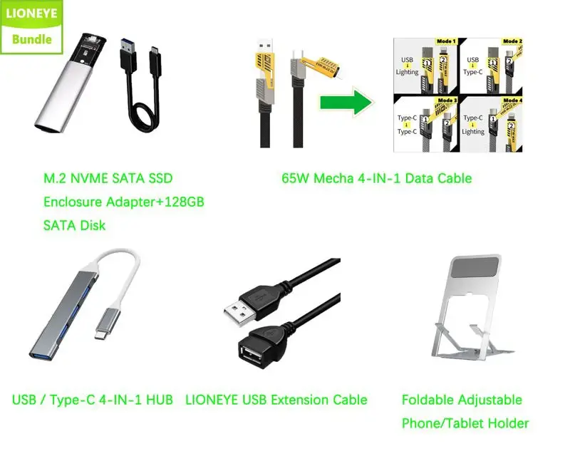 M.2 NVME SATA SSD Enclosure Adapter + 128GB SATA Disk + Foldable Adjustable Phone/Tablet Holder + 65w Mecha Data Cable + USB/Type-C 4-IN-1 HUB + LIONEYE USB Extension Cable