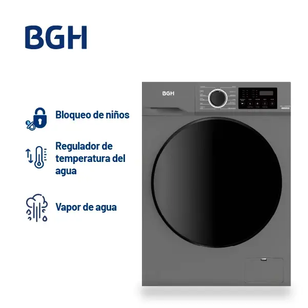 Lavarropas Automático BGH Inverter 8kg BWFE08S24AR – Dark Silver Tecnología avanzada para un lavado eficiente Este lavarropas cuenta con tecnología Inverter, que optimiza la eficiencia energética y reduce el ruido, proporcionando mayor durabilidad y ahorro en comparación con un lavarropas tradicional. Clase de eficiencia energética A+++, para un menor consumo eléctrico sin resignar rendimiento. Sistema Europeo: Cuidado superior de tus prendas Imita el lavado a mano, moviendo la ropa de arriba hacia abajo para garantizar la máxima protección de los tejidos. Carga autoadaptativa, regula automáticamente la cantidad de agua según la carga de ropa detectada en el tambor. Regulador de temperatura, permitiendo seleccionar desde agua fría hasta 90°C, adaptándose a cada tipo de tela. Diseño y capacidad para tu hogar Con su capacidad de 8 kg y tambor de acero inoxidable de 60 litros, ofrece mayor espacio para el lavado sin ocupar más lugar en tu hogar. Funcionalidad y seguridad en cada lavado Bloqueo para niños, evitando la manipulación accidental del panel de control. Display LED de alta tecnología, brindando un control intuitivo y fácil de usar. Tambor de acero inoxidable, garantizando mayor resistencia y durabilidad. Entrada de agua única, simplificando la instalación. Dimensiones y capacidad La profundidad con la puerta abierta es de aproximadamente 83 cm. Accesorios incluidos Manual de usuario Manguera de entrada Manguera de desagote Topes para los agujeros de los tornillos de fijación Llave para quitar los tornillos de fijación y nivelación del equipo Disfrutá de un lavado más eficiente, silencioso y con el máximo cuidado para tu ropa.