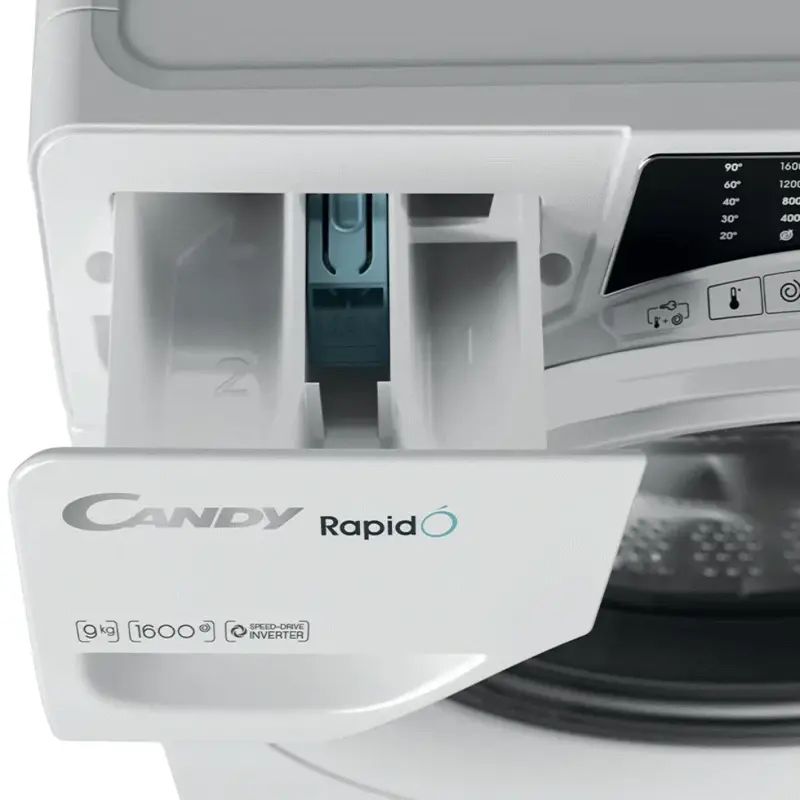 - RO1696DWH71-12 Candy RapidÓ, la forma más fácil de ahorrar tiempo Características Capacidad de 9 Kg 1600 RPM 16 Programas 9 Programas rápidos Color blanco Medidas (ANxALxPR): 60 x 85 x 58 cm Garantía 12 meses RapidÓ Candy RapidÓ es la forma más fácil de ahorrar tiempo. Gracias al set más completo de 9 programas rápidos, tu lavarropas Candy RapidÓ te ayuda a maximizar el tiempo para dedicarlo a las cosas que más te gustan. Comodidad inigualable Para facilitar al máximo tu lavado diario, Candy RapidÓ está equipado con una puerta más alta y más ancha. Este nuevo diseño ergonómico te permite realizar la carga y descarga sin ningun esfuerzo y de manera más fácil. Innovador Motor Speed Drive Inverter Speed-Drive Inverter es un innovador y duradero motor sin escobillas que te permite ahorrar tiempo consiguiendo resultados perfectos. Es capaz de aumentar el poder de limpieza hasta en un 50% (en comparación con un motor estándar universal), al tiempo que reduce el consumo de energía y las molestas vibraciones. El lavado perfecto para tus prendas La exclusiva tecnología Quick&Clean mezcla agua y detergente en una única solución altamente concentrada. El dispositivo pulveriza la solución en el tambor de la lavadora con un chorro de alta presión, que penetra profundamente en las fibras de los tejidos. Esta nueva tecnología aumenta el poder de lavado del detergente, lo que permite reducir las temperaturas normales de lavado: se pueden conseguir resultados de lavado de 40º a 20º, de 60º a 40º, y una limpieza realmente profunda para tejidos muy sucios a 60º. Ahorra tiempo Simplemente elige entre los 9 programas rápidos (14 ', 29', 30 ', 39', 44 ', 59') para lograr los mejores resultados en menos de 1 hora. Gracias al Motor Speed Drive Inverter que aumenta hasta un 50% la acción de limpieza, comparado con un motor de un lavarropas tradicional. Máxima higiene en menos de una hora Daily Hygiene es el programa rápido de 60ºC que garantiza una desinfección y limpieza en profundidad de tu ropa en tan solo 59 minutos. Snap & Wash: Encuentra el programa ideal fácilmente Descubre qué ciclo se adapta mejor a la cantidad, el tipo y el color de las prendas tan solo utilizando tu smartphone. Gracias a la función exclusiva Snap&Wash de Candy RapidÓ, simplemente tomá una foto de tu ropa a lavar para obtener la recomendación del mejor programa . Además, establece automáticamente la temperatura y velocidad de centrifugado adecuadas. Reduce el tiempo de planchado Con la opción Steam del lavarropas RapidÓ podes reducir el tiempo de planchado ya que activando esta función especial las fibras de tus prendas estarán más relajadas, facilitando su planchado posterior. Programas de Lavado Aclarados Algodón EEE Algodón Perfecto 59' Algodón resistente Color y mixtos 59 Delicados 59' Deporte plus 29' Desagüe & centrifugado Diario 39' Eco 14'30'44 Eco 20° Higiene plus 59' Lana/a mano Sintéticos y ropa de color