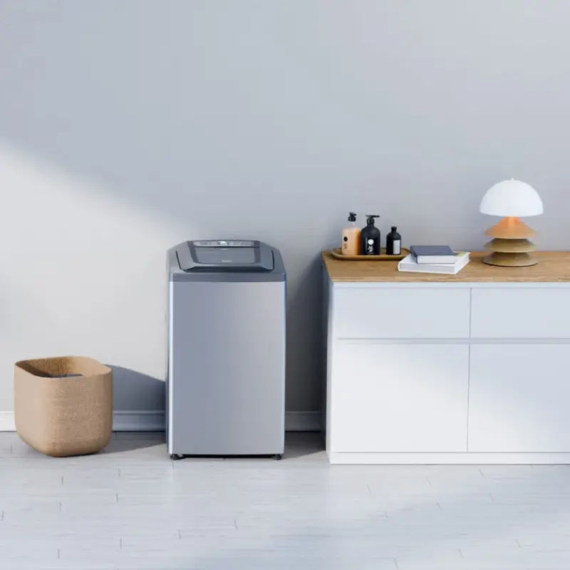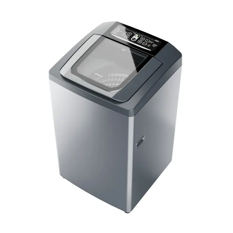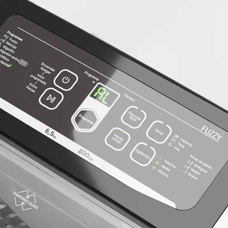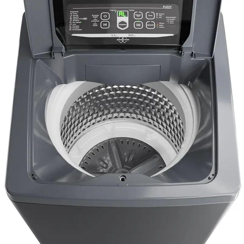 Lavarropas automático de carga superior. Capacidad de 6,5 Kg. Color gris. Velocidad de 800 RPM. Eficiencia A+. Sistema de lavado oriental. Display LED digital. Tapa de vidrio templado. Tambor de acero inoxidable. Alarma fin de lavado. Funciones Fuzzy, media carga, plancha fácil y lavado rápido.
