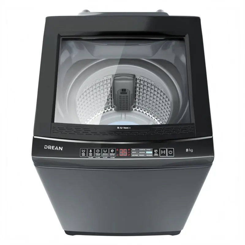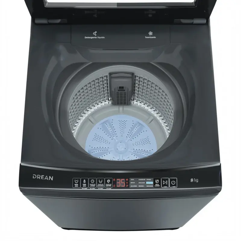 Lavarropas automático de carga superior. Su capacidad de lavado es de 8 Kg. Su velocidad de centrifugado es regulable hasta 660 RPM. Color gris. Eficiencia energética A+. Sistema de lavado oriental. 9 programas de lavado: ECO, Remojo, Lavado a mano, Algodón EEE, Acolchado, Delicado, Express, Satinizado y Para mañana. Display LED. ID System con ajuste de agua inteligente. Inicio diferido hasta 24 hs. Tambor de acero inoxidable con tecnología Pillow Drum y doble filtro atrapapelusa. Tapa de vidrio con cierre Soft Close. Función de secado y aire fresco. Alarma fin de lavado.