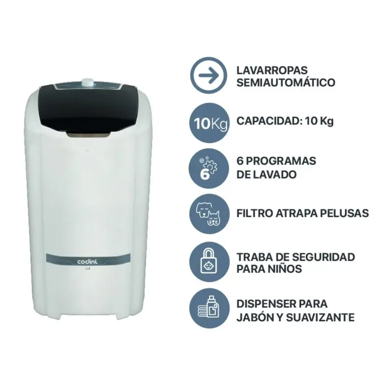 ¡Nuevo Lanzamiento Semiautomático Codini 8052!Codini presenta el nuevo lavarropas semiautomático Q-BICO 8052, una innovadora solución para tus necesidades de lavado. Con un diseño moderno y elegante, este lavarropas cuenta con una capacidad de 10 kg, perfecto para familias que buscan eficiencia y tecnología de vanguardia.Características:Función enjuague: Asegura que tu ropa quede completamente limpia, eliminando residuos de detergente y suavizante.Sistema atrapa pelusas: Disfruta de la limpieza sin preocuparte por pelusas y residuos no deseados, gracias a su avanzado sistema que los captura de forma eficaz.Compartimientos para jabón y suavizante: Los compartimientos están diseñados para garantizar que los productos de lavado se dosifiquen de manera óptima durante el ciclo.6 programas de lavado: Variedad de opciones para adaptarse a todo tipo de ropa, desde prendas delicadas hasta cargas más grandes y resistentes, con un rendimiento eficiente en cada uno de ellos.Diseño moderno: Con un acabado atractivo y funcional, el Codini 8052 se integra perfectamente en cualquier espacio, añadiendo un toque de modernidad a tu hogar.Especificaciones Técnicas:Capacidad: Hasta 10 kg de ropa secaDimensiones generales: 90 cm alto x 51 cm ancho x 56 cm profundidadAltura con tapa abierta: 133 cm aproxPeso: 12,5 KGPotencia: 120WCarga y descarga de agua: ManualNo posee función centrifugado Con el lavarropas semiautomático 8052, cada lavado será una experiencia cómoda, eficiente y sin complicaciones. ¡Haz que tu día a día sea más simple con este electrodoméstico de última generación!