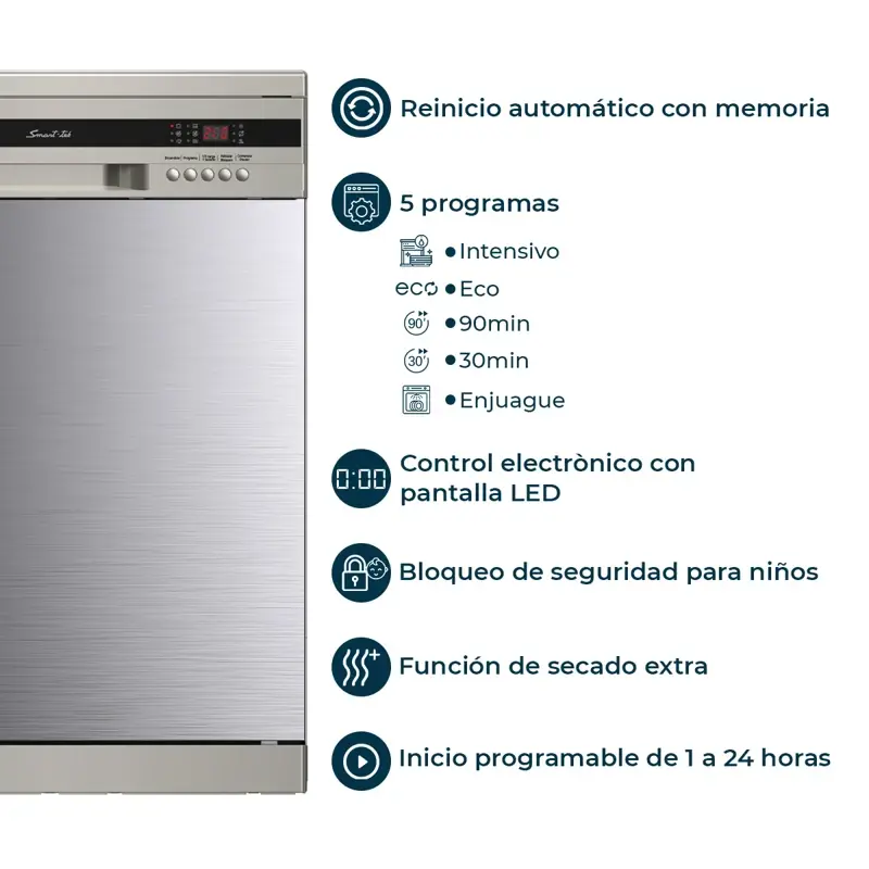 - Inicio programable (1 a 24 horas): Lava tus platos cuando más te convenga.