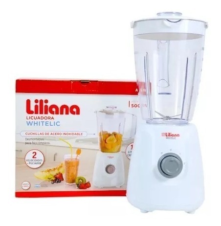 LICUADORA - LilianaMod. WHITELIC AL100Características• Cuchilla de acero inoxidable dentada y desmontable para fácil limpieza.• Jarra plástica de 1.5 lts.• 2 velocidades + pulsador.• Base antideslizante.• Tapa con pico vertedor.• Tapa para agregar ingredientes.• Cierre de seguridad.• Potencia: 500 watts.*************************************************************************************************************************************************************72hs de prueba con nosotrosGARANTIA DE 24 MESES CON LA MARCA