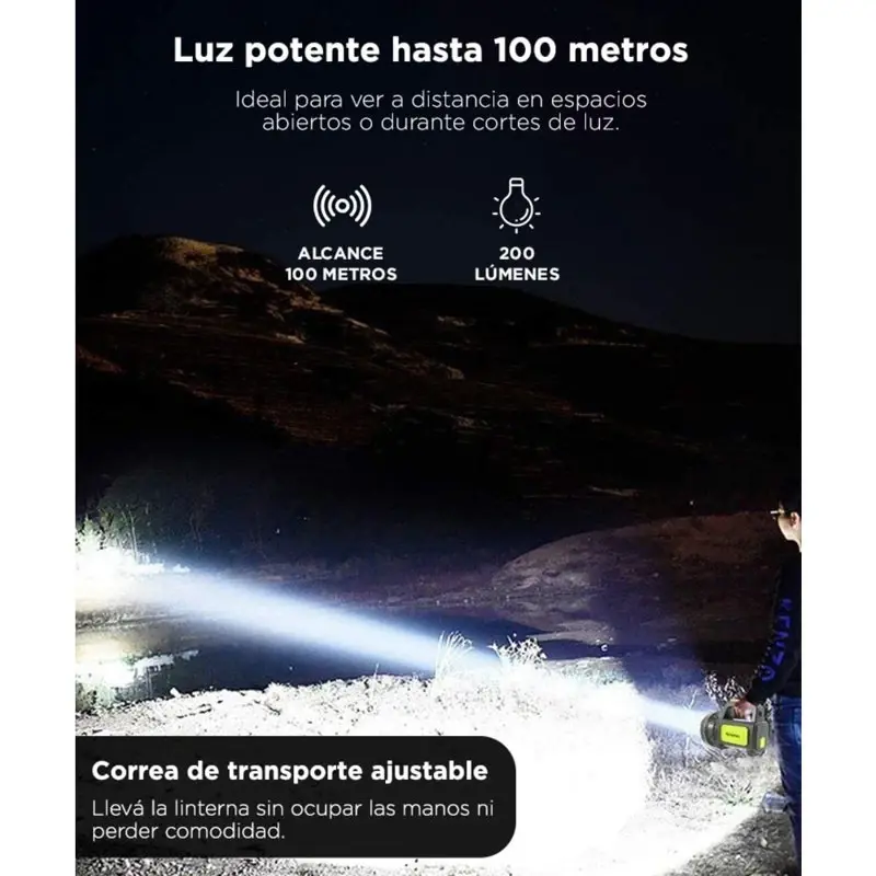Proyecta un haz potente y definido de hasta 100 metros. Ideal para situaciones de baja visibilidad, como campamentos, senderismo o cortes de energía. Su potencia permite iluminar caminos, interiores amplios o puntos específicos a gran distancia.