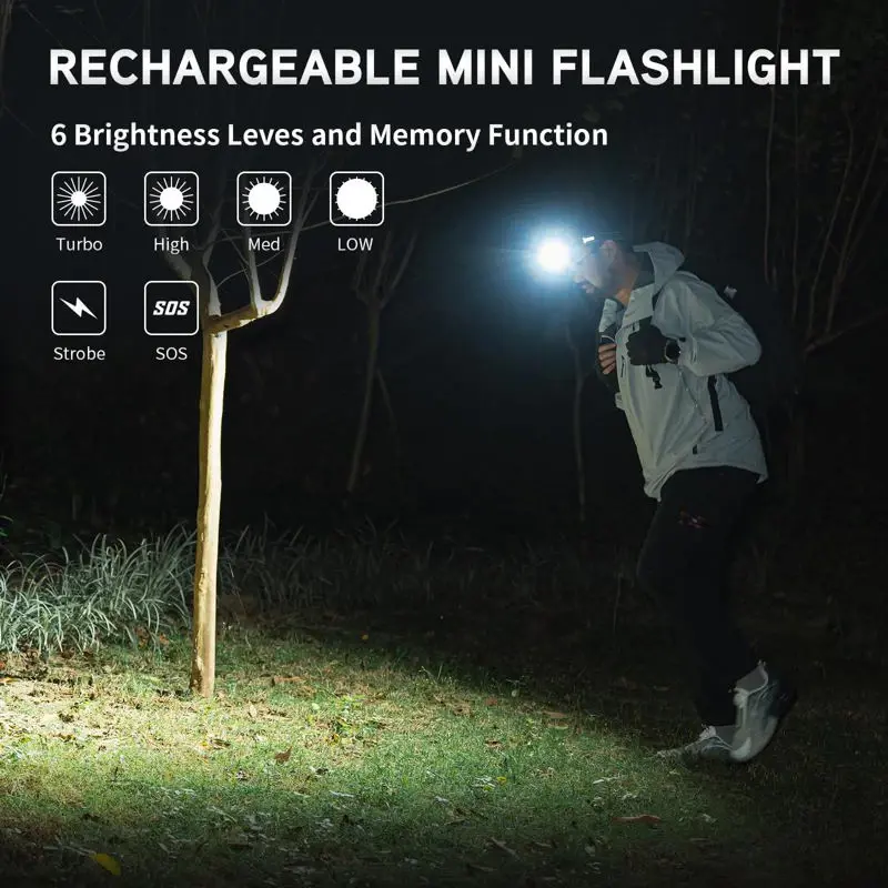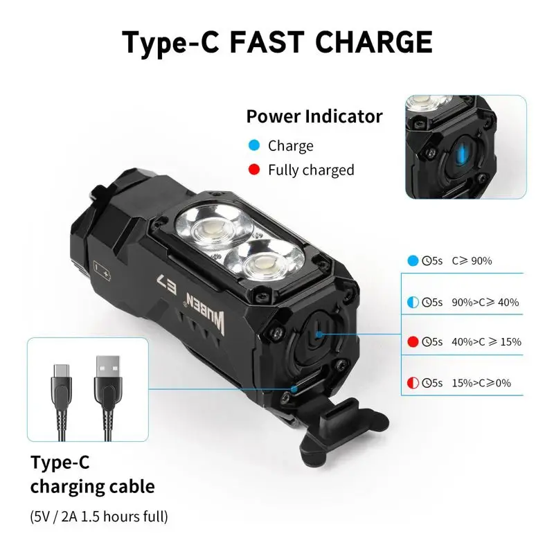 - 6 modos súper brillantes: las linternas recargables WUBEN E7 tienen 6 modos de iluminación: alto/medio/bajo/superbrillante/estroboscópico/SOS, con función de memoria; haz clic en el interruptor y pulsa larga para activar la selección de engranajes; doble clic para iluminar el modo súper brillante; tres clics para ráfaga de modo de flash; cuatro clics consecutivos para bloquear la linterna, evita encender la linterna por un toque accidental.