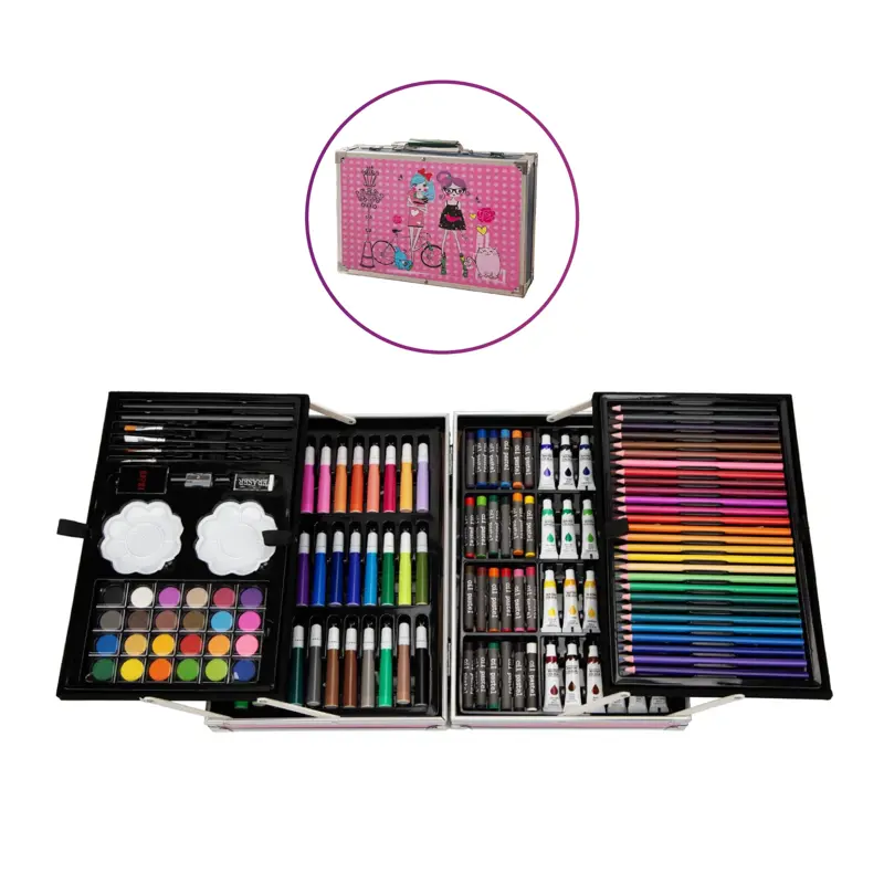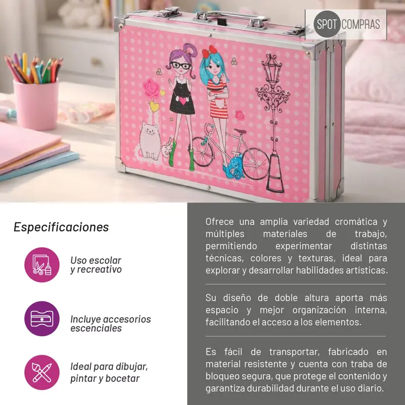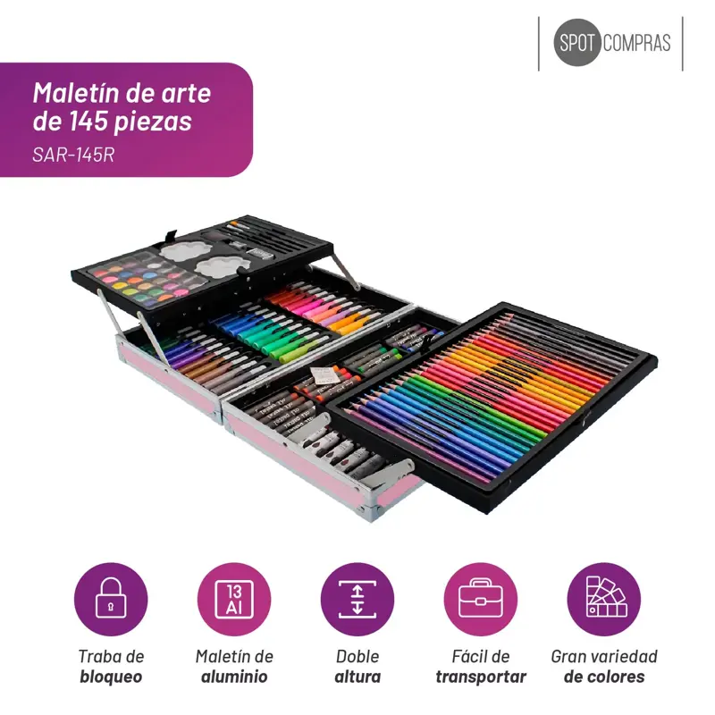 ¡Prepárate para un regreso a clases lleno de color e inspiración! Este espectacular maletín de 145 piezas es el aliado perfecto para que los más chicos inicien el año escolar explorando todo su potencial creativo desde el primer día. Con una selección completísima que incluye desde acuarelas y pasteles al óleo hasta marcadores vibrantes y lápices de colores, este set ofrece todas las herramientas necesarias para transformar cualquier proyecto de plástica o actividad recreativa en una verdadera obra de arte, fomentando la expresión y el talento en cada trazo.Pensado para la dinámica del día a día escolar, su resistente estructura de aluminio y su sistema de organización de doble altura garantizan que cada pincel y accesorio se mantenga siempre protegido y en su lugar. Gracias a su diseño ligero de 1.9 kg y sus trabas de seguridad, es sumamente fácil de transportar a la escuela o a talleres extraescolares, brindando durabilidad y un estilo único que hará que la vuelta al cole sea la aventura más divertida del año. (Imágenes generadas mediante inteligencia artificial con fines ilustrativos)