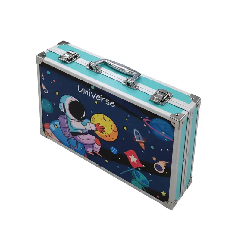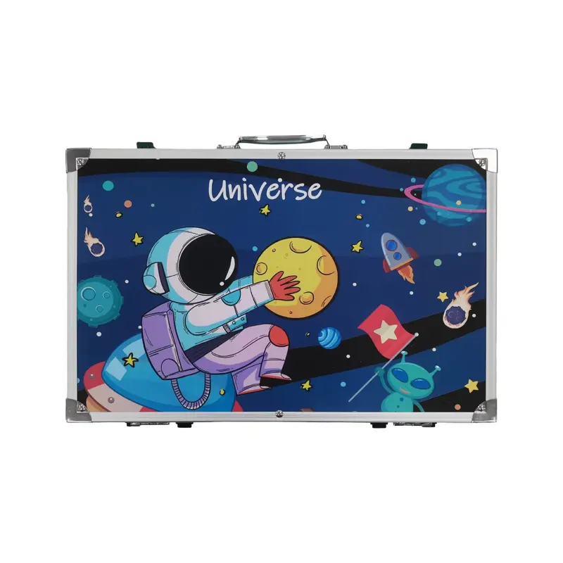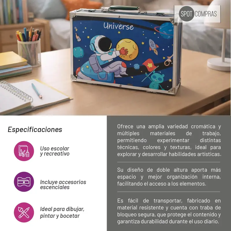 ¡Preparate para un regreso a clases lleno de color y creatividad! Este espectacular maletín de arte "Universe" de 145 piezas es la herramienta definitiva para que los chicos encaren sus proyectos escolares con total entusiasmo y originalidad. Desde detallar mapas y carátulas con sus 28 lápices de colores hasta experimentar con acuarelas y pasteles al óleo, este set ofrece una variedad cromática infinita para transformar cualquier tarea en una verdadera obra maestra. Es el aliado ideal para despertar la imaginación desde el primer día de clase, permitiendo explorar texturas y técnicas que harán que cada actividad artística sea una aventura espacial inolvidable.Diseñado para resistir el ritmo del año lectivo, su robusta estructura de aluminio con sistema de doble altura garantiza una organización impecable, evitando que los materiales se pierdan entre tareas. Gracias a su traba de seguridad y asa ergonómica, es sumamente ligero y fácil de transportar, convirtiéndose en el estudio de arte portátil perfecto para lucirse en el aula o disfrutar en casa. Con este maletín, la vuelta al cole se vuelve mucho más inspiradora, asegurando que el talento y la diversión acompañen a los pequeños artistas en cada paso de su aprendizaje. (Imágenes generadas mediante inteligencia artificial con fines ilustrativos)