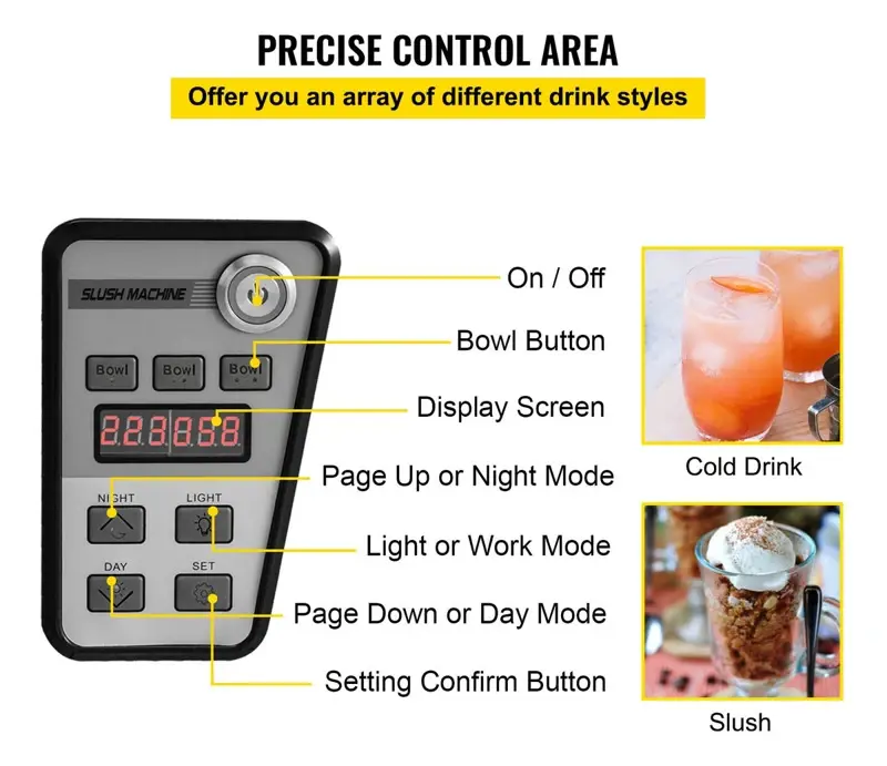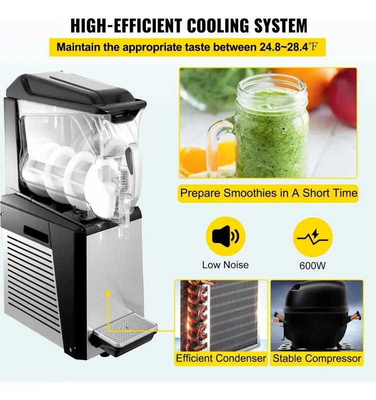 10L Slushy Machine: Viene con un tanque grande con la capacidad de 10 L/2.6 galones estadounidenses, nuestra máquina granizada sirve alrededor de 40 tazas de deliciosos granizados y bebidas congeladas a un gran número de personas. El cuerpo de acero inoxidable grueso de 3 capas proporciona una larga vida útil y un alto rendimiento a prueba de óxido, a prueba de abrasión. Los cuencos dobles de polipropileno de grado alimenticio están diseñados con una carcasa transparente y altamente visible para que tus bebidas puedan identificarse claramente.