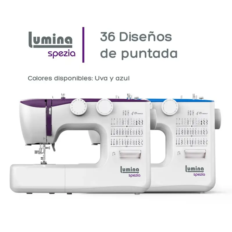 La máquina de coser Spezia está construida para la velocidad y esta lista para ayudarte a realizar todos tus proyectos gracias a sus 36 diseños de puntadas. Es lo suficientemente poderosa para coser tejidos más gruesos, siempre y cuando utilice el pie prénsatela correcto para potenciar la máquina al máximo! Elegí tu próximo proyecto, planifícalo, diséñalo y hacelo realidad con tu nueva máquina de coser Spezia CARACTERÍSTICAS GENERALES : - 36 Diseños de puntada- Botón de puntada inversa- Ojal en 4 pasos- Soporte de pie prénsatela universal- Brazo libre para costuras circulares- Luz LED de larga duración- Cortador de hilo manual- Bobinado automático- Pasador de carrete telescópico- Manija para transportar la máquina- Enhebrado automático- Pedal electrónico - Opción de colores: Uva- AzulESPECIFICACIONES TECNICAS: - Aguja: HA X 1 - Motor: 60W- Luz LED: 2W- Voltaje: 220 Vca- Frecuencia: 50 Hz- Peso Neto: 5,8 kg - Peso Bruto: 7,1 kg - Velocidad de Costura?: 700±50 ppm- Medidas de la Máquina: 42 x 17 x 30 cm- Medidas de Caja: 48 x 21,5 x 33,5 cm- Altura Máxima del Pie: 5.5 mm- Longitud Máxima de Puntada: 4 mm- Ancho Máximo de Puntada: 4 mmACCESORIOS INCLUIDOS: - Pie prensatela estándar- Pie prensatela para cierres- Pie prensatela para ojales- Pie prensatela para botones- Guía de dobladillo- 3 bobinas- Kit de agujas- Corta costura / cepillo- Destornillador multifunción- Doble aguja- Aceitero- Funda para la máquina