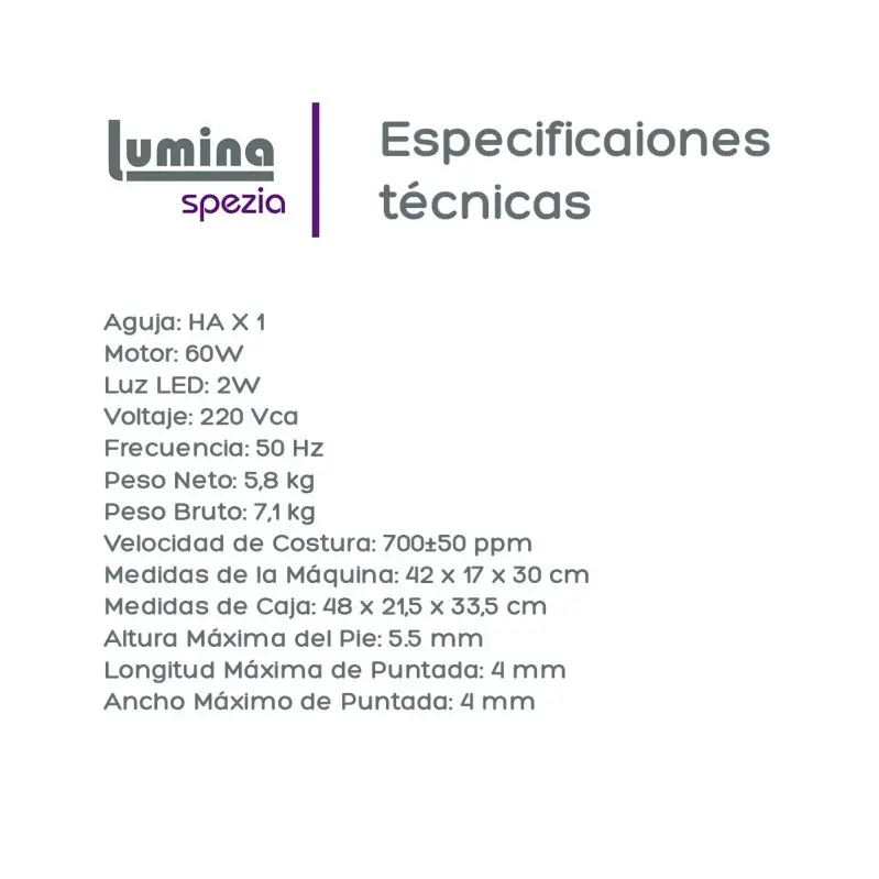 La máquina de coser Spezia está construida para la velocidad y esta lista para ayudarte a realizar todos tus proyectos gracias a sus 36 diseños de puntadas. Es lo suficientemente poderosa para coser tejidos más gruesos, siempre y cuando utilice el pie prénsatela correcto para potenciar la máquina al máximo! Elegí tu próximo proyecto, planifícalo, diséñalo y hacelo realidad con tu nueva máquina de coser Spezia CARACTERÍSTICAS GENERALES : - 36 Diseños de puntada- Botón de puntada inversa- Ojal en 4 pasos- Soporte de pie prénsatela universal- Brazo libre para costuras circulares- Luz LED de larga duración- Cortador de hilo manual- Bobinado automático- Pasador de carrete telescópico- Manija para transportar la máquina- Enhebrado automático- Pedal electrónico - Opción de colores: Uva- AzulESPECIFICACIONES TECNICAS: - Aguja: HA X 1 - Motor: 60W- Luz LED: 2W- Voltaje: 220 Vca- Frecuencia: 50 Hz- Peso Neto: 5,8 kg - Peso Bruto: 7,1 kg - Velocidad de Costura?: 700±50 ppm- Medidas de la Máquina: 42 x 17 x 30 cm- Medidas de Caja: 48 x 21,5 x 33,5 cm- Altura Máxima del Pie: 5.5 mm- Longitud Máxima de Puntada: 4 mm- Ancho Máximo de Puntada: 4 mmACCESORIOS INCLUIDOS: - Pie prensatela estándar- Pie prensatela para cierres- Pie prensatela para ojales- Pie prensatela para botones- Guía de dobladillo- 3 bobinas- Kit de agujas- Corta costura / cepillo- Destornillador multifunción- Doble aguja- Aceitero- Funda para la máquina