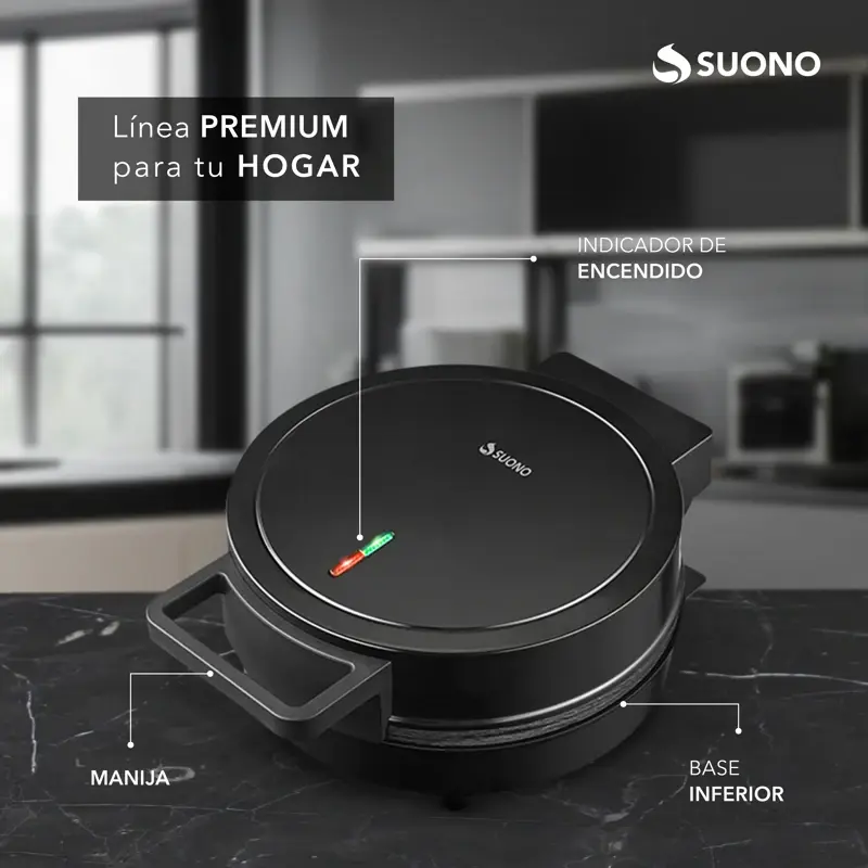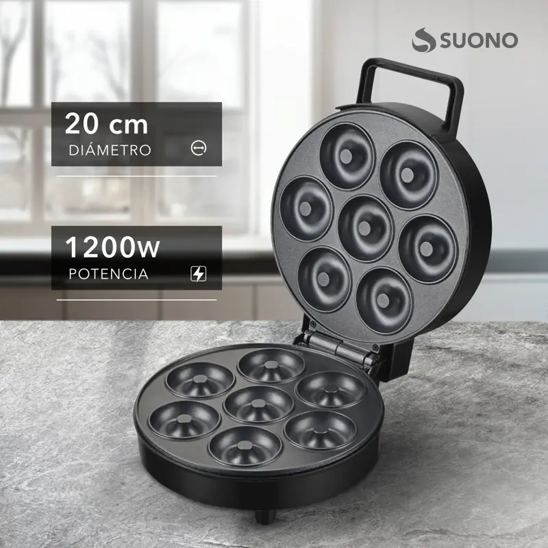 ¡Prepara donas caseras deliciosas y esponjosas en minutos con la Máquina para Hacer Donas Suono! Diseñada para quienes aman la repostería, esta máquina compacta y fácil de usar es perfecta para hacer donas dulces o saladas de manera rápida y segura. Características destacadas: Placa de 20cm de diámetro: Ideal para preparar donas de tamaño uniforme y perfecto. Superficie antiadherente: Garantiza que tus donas no se peguen y facilita la limpieza. Calentamiento rápido y uniforme: Tus donas estarán listas en pocos minutos gracias a su sistema de calentamiento eficiente. Diseño compacto y portátil: Perfecto para cualquier cocina, fácil de almacenar y transportar. Luz indicadora de encendido y listo: Para un uso seguro y práctico. Especificaciones generales: Modo de uso: Prepara tu mezcla favorita para donas. Precalienta la máquina hasta que la luz indicadora lo señale. Vierte la mezcla en los moldes, cierra la tapa y espera unos minutos. Retira las donas fácilmente gracias a su superficie antiadherente. Ideal para reuniones familiares, cumpleaños o simplemente para disfrutar de un antojo, la Máquina para Hacer Donas Suono Donut Maker te permite explorar tu creatividad en la cocina con recetas únicas y deliciosas. ¡Llévala a casa y haz de cada día una ocasión especial con donas recién hechas!