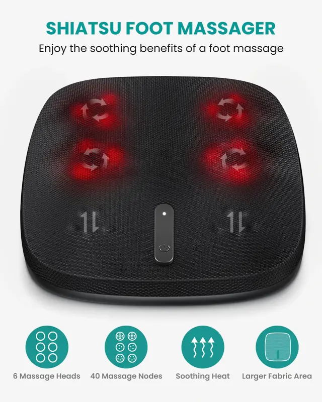 - Revitaliza tus pies: este masajeador de pies Nekteck mejorado está diseñado con un tejido de cobertura total para mayor comodidad y un amasado profundo. Con 6 cabezales de masaje con 40 nodos masajeadores, ayuda a aliviar el estrés y la tensión diarios.