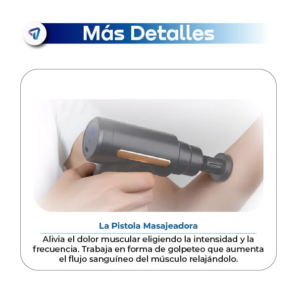 La Pistola Masajeadora MG-002 es perfecta para la recuperación muscular tras el deporte, la rehabilitación de lesiones o el alivio de dolores musculares. Con 6 niveles de intensidad ajustables hasta 2500 RPM y 4 cabezales intercambiables, proporciona masajes específicos que reducen la inflamación, alivian la rigidez y mejoran la circulación, relajando los tejidos. Funciona con batería recargable de 1800 mAh, tiene una duración de 1 hora y se carga completamente en 4 horas mediante USB. Compacta y liviana, pesa solo 0.6 kg y mide 14 x 14 x 4 cm, con una potencia de 24W que garantiza un masaje efectivo y adaptable a diferentes necesidades.