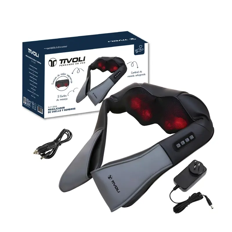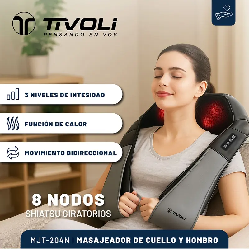 Descubre el Masajeador Multiuso Tivoli Eléctrico MJT-204N, diseñado para ofrecerte una experiencia de relajación profunda en la comodidad de tu hogar. Con 8 nodos rotativos y un sistema de movimiento bidireccional, este masajeador se adapta a diversas zonas del cuerpo, incluyendo cervicales, espalda, cintura y piernas, brindando un alivio efectivo para la tensión muscular.