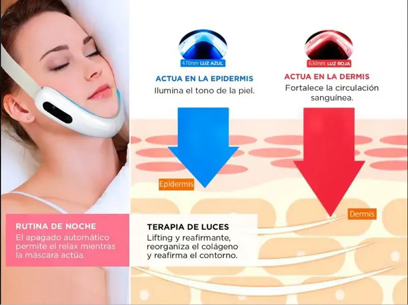 ¡Nueva máscara facial reductora by gadnic! Elegí entre sus 6 modos: Reductor; Masaje de alta vibración; Terapia de calor; Función de tapping; Terapia de luz roja; terapia de luz azul Tecnología aplicada a la dermis y epidermis: La luz azul actúa mejorando el aspecto de la piel, mejora la visibilidad de los poros, y rejuvenece la piel. Mientras que la luz roja actúa en la epidermis mejorando la circulación de la sangre, mejorando la elasticidad y reduciendo la flacidez de la zona. Recomendamos combinar ambas tecnologías para mejores resultados Ideal para sumar a rutinas de noche: Posible gracias a su función de apagado automático podrás relajarte mientras la mascara actúa. Es ideal para lograr un momento de relajación al finalizar tu rutina y obtener resultados en pocas sesiones. Uso profesional y personal: Su uso externo y terapia no invasiva la convierten en un artefacto ideal para uso profesional dentro del gabinete y uso personal Tecnología de electroestimulacion: Es una técnica que utiliza micro corriente para causar una contracción muscular de manera similar a los impulsos que envía el sistema nervioso central para controlar las acciones de los músculos, por eso es ideal para quienes buscan reducir el contorno y papada