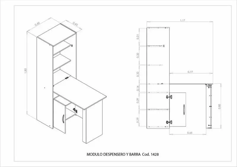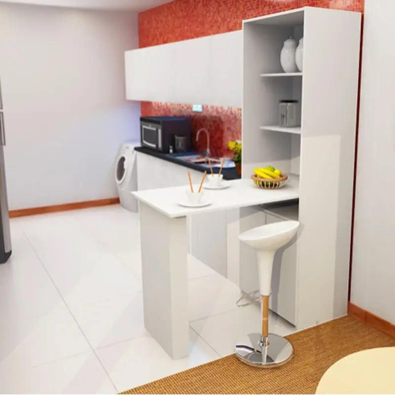 Mueble multifuncional con espacio de guardado y una mesa barra plegable para optimizar el espacio disponible. Se puede utilizar como despensero y barra para la cocina, escritorio, mesa de trabajo, guarda libros, como pequeño espacio de trabajo y oficina.