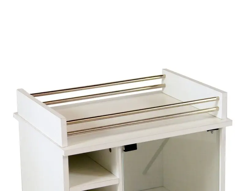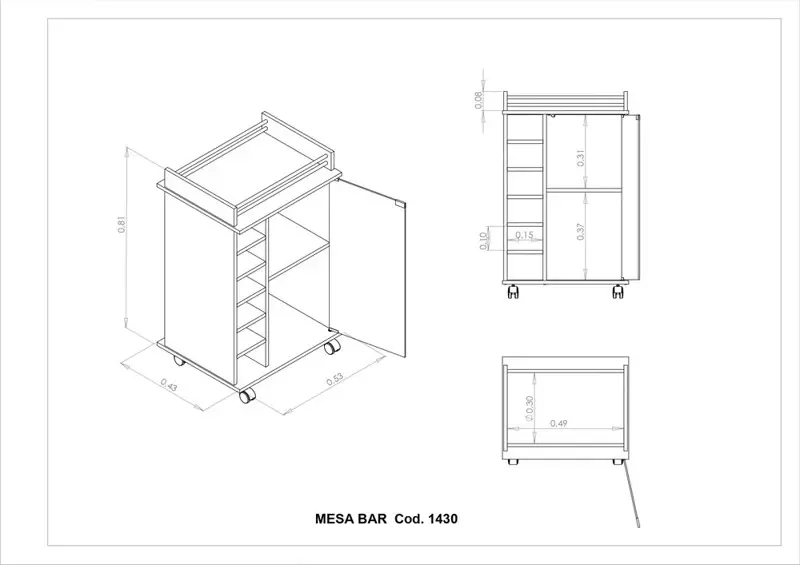 Mesa de arrime móvil, con ruedas, puerta de vidrio, nicho para las botellas y base de apoyo superior con barandas de caño metálico.DESTACADOS:- Puerta de Vidrio con cierre push.- Tapacantos de PVC de 0,45 mm para proteger los cantos.- Ruedas reforzadas.- Nicho para botellas.- Herrajes metálicos.- Mueble para armar.