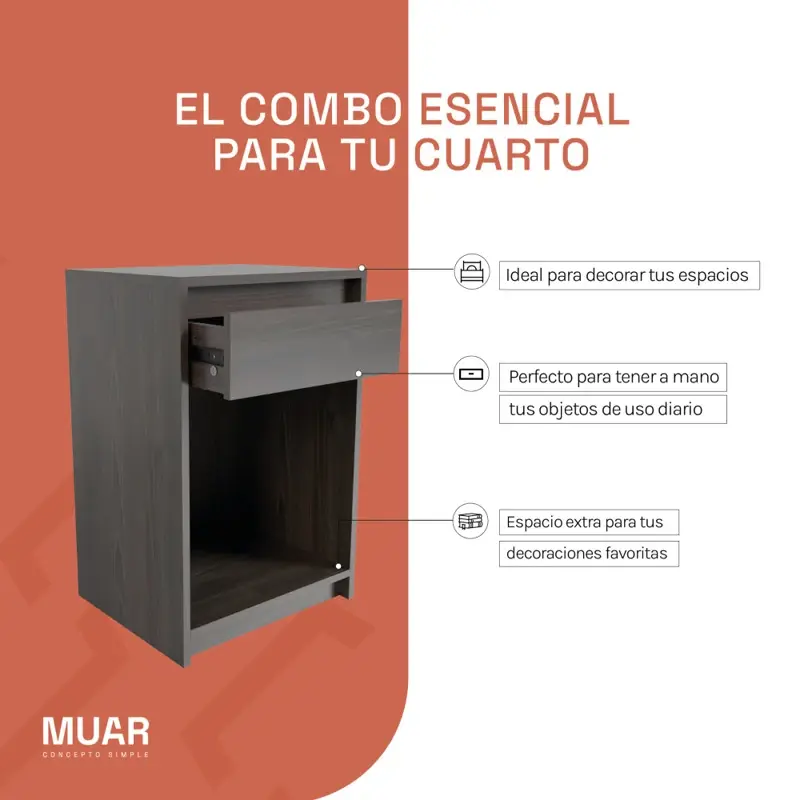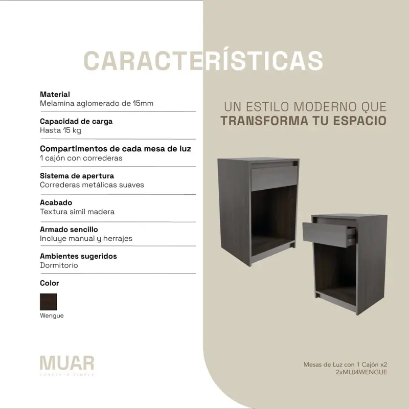 El modelo ML04 cuenta con un cajón con correderas de aluminio, que permite un acceso fácil y cómodo a tus objetos personales. Además, su bandeja extraíble ofrece una funcionalidad adicional, facilitando la organización y el almacenamiento.