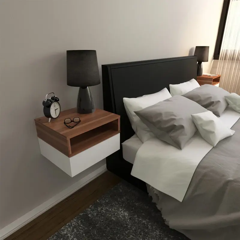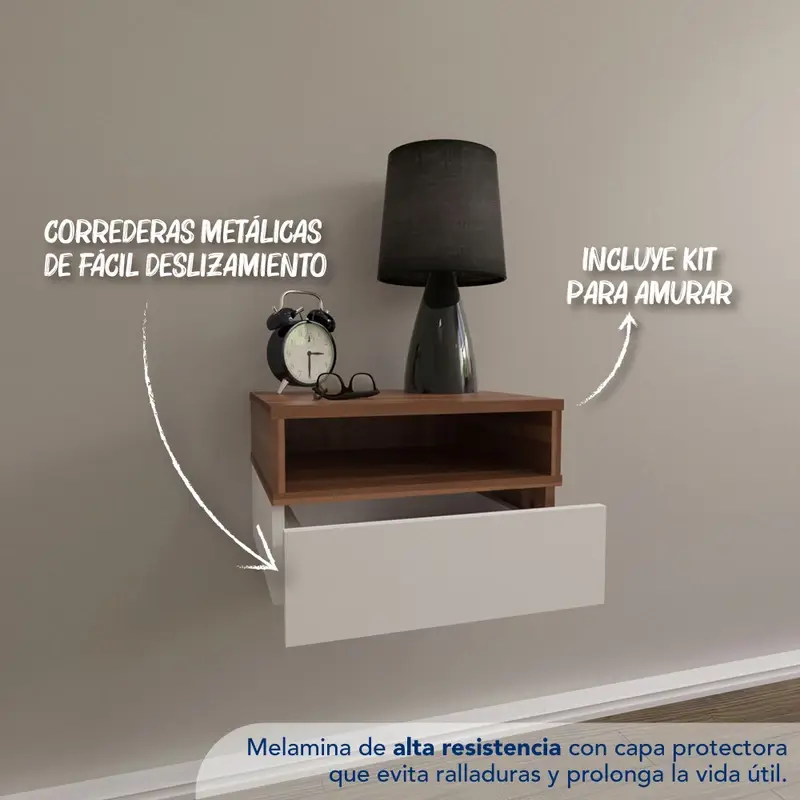 Mesa de luz flotante, ideal para ubicar según tus necesidades y optimizar espacios. Contiene un cajón y un estante para organizar tus pertenencias como más te guste.