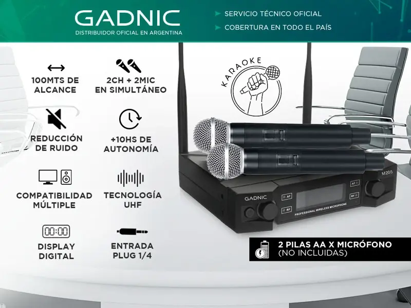 GADNIC presenta su nueva línea de micrófonos inalámbricos profesionales. El diseño inalámbrico le permite ir más allá de lo que lo harías con un micrófono con cable. Llevá tus sentidos al máximo experimentando ésta línea de micrófonos profesionales. Podrás usarlos para conferencias, karaoke, charlas y demás. ¡Su selector de volumen y largo alcance lo hacen el más versátil del mercado!