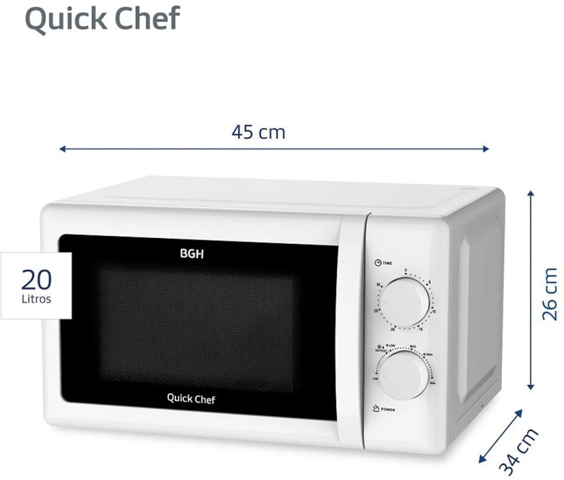 El horno microondas posee 6 niveles de potencia para cocinar o calentar, además posee la función de descongelado automático y menues automáticos. Incluye también reloj con timbre, traba de seguridad para niños, que bloquea el teclado para evitar accidentes.