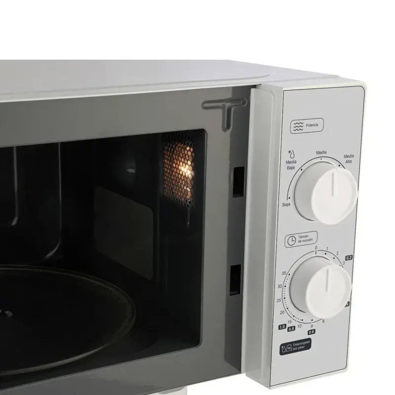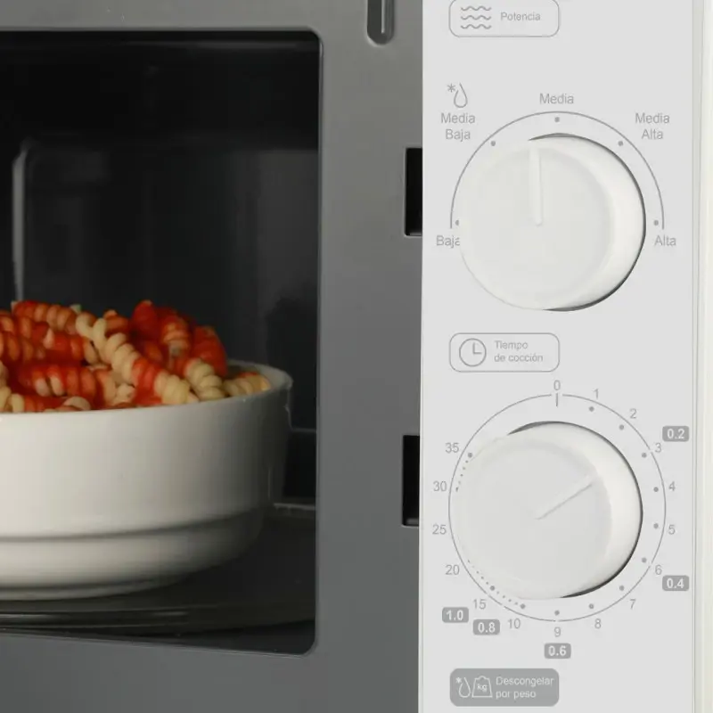 Este modelo cuenta con control mecánico mediante perillas giratorias, lo que permite un uso simple e intuitivo. Su capacidad de 20 litros es perfecta para calentar, cocinar o descongelar porciones diarias con comodidad. Además, ofrece funciones como descongelado por peso o tiempo, adaptándose a diferentes necesidades.