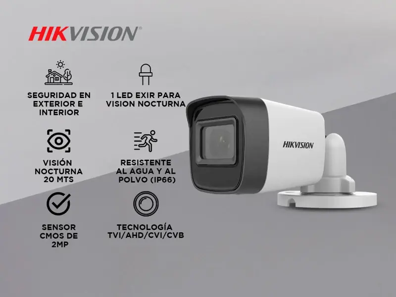 La cámara de seguridad exterior EXIR Bullet de 2MP es una solución confiable para la vigilancia de exteriores. Con un potente sensor CMOS de 2MP y un LED EXIR, esta cámara ofrece imágenes nítidas y claras tanto de día como de noche, con una visión nocturna de hasta 20 metros. Equipada con función ICR, esta cámara garantiza una transición suave entre el día y la noche, proporcionando una vigilancia continua en todo momento. Además, su sensibilidad de 0.02 Lux/F1.2 asegura una excelente calidad de imagen incluso en condiciones de poca luz. Con alimentación de 12 VDC y protección IP66 contra los elementos, esta cámara es adecuada para su uso en entornos exteriores exigentes. Además, su diseño compacto y lente ajustable de 2.8/3.6mm proporcionan flexibilidad en la instalación y un amplio campo de visión. La cámara de seguridad exterior EXIR Bullet de 2MP es compatible con una variedad de señales de video, lo que la hace ideal para integrarse en sistemas de seguridad existentes. Con Smart IR y DNR, esta cámara ofrece una vigilancia confiable y de alta calidad en todo momento. ¡Asegura tu propiedad con la cámara de seguridad exterior EXIR Bullet de 2MP y mantén la tranquilidad en todo momento! Especificaciones Sensor CMOS: 2MP Leds: 1 pcs Visión Nocturna: Hasta 20 metros Tipo: Exterior EXIR Bullet Función ICR: Sí Sensibilidad: 0.02 Lux/F1.2 Alimentación: 12 VDC Smart IR: Sí DNR: Sí Protección: IP66 Lente: 2.8/3.6mm Señales de Video Soportadas: TVI/AHD/CVI/CVBS