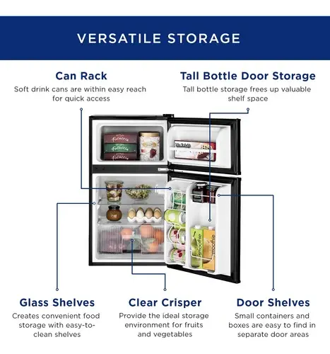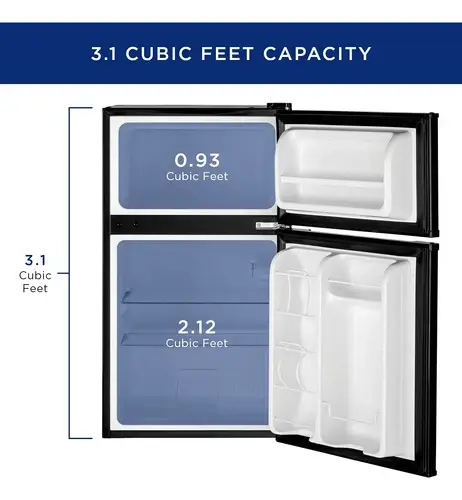 ESPACIO AMPLIO Espacioso, 3,1 pies cúbicos. El refrigerador de pies cúbicos incluye dos estantes de vidrio, almacenamiento en la puerta y un cajón transparente para verduras un verdadero congelador, el espacioso compartimento congelador de 0.93 pies cúbicos es lo suficientemente grande para una bandeja de hielo, comidas en caja y otros artículos congelados