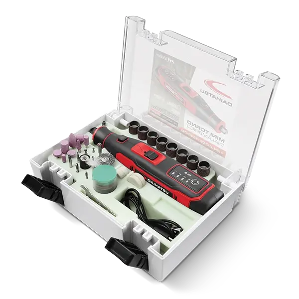 El minitorno Daihatsu de 3.6V es la herramienta perfecta para artesanos, hobbistas y profesionales que requieren realizar trabajos minuciosos. Gracias a su diseño compacto, batería interna de alta capacidad y un completo set de accesorios, permite abordar tareas de grabado, pulido y amolado con total libertad de movimiento y un control excepcional.