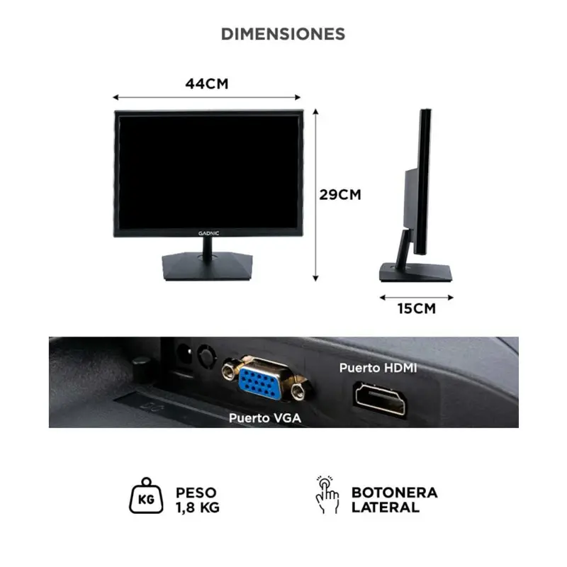 Descubrí el Monitor LED Gadnic de 19 pulgadas, una solución versátil y de alto rendimiento diseñada para satisfacer las necesidades de una amplia variedad de entornos, desde oficinas y hogares hasta centros educativos y comerciales. Con una resolución de 1440x900, una tasa de refresco de 75Hz y una reproducción de 16.7 millones de colores, este monitor ofrece una calidad de imagen impresionante y una experiencia visual cómoda. El Monitor LED Gadnic combina tecnología avanzada con un diseño elegante y funcional. Sus múltiples opciones de conectividad, incluyendo puertos VGA y HDMI, garantizan una integración fácil y rápida con diversos dispositivos. Además, su soporte para montaje VESA facilita una instalación flexible en cualquier espacio. Con características adicionales como un bajo consumo energético, controles intuitivos y soporte multilenguaje, el Monitor LED Gadnic es la elección perfecta para mejorar su productividad y disfrutar de una visualización de alta calidad. Mejore su entorno con la confiabilidad y el estilo del Monitor LED Gadnic de 19 pulgadas. Especificaciones Tamaño del Panel: 19” Relación de Aspecto: 16:10 Tasa de Refresco: 75Hz Resolución: 1440*900 Tiempo de Respuesta: = 14ms Ángulo de Visión: 90 (Horizontal) / 65 (Vertical) Paso de Píxeles: 0.2835*0.2835mm Colores: 16.7 millones Brillo: 200 cd/? Relación de Contraste: 600:1 VGA: 1 HDMI: 1 Voltaje de Operación: AC 100-240V, 50-60Hz, DC 12V Consumo de Energía: = 50W Montaje VESA: Soporte