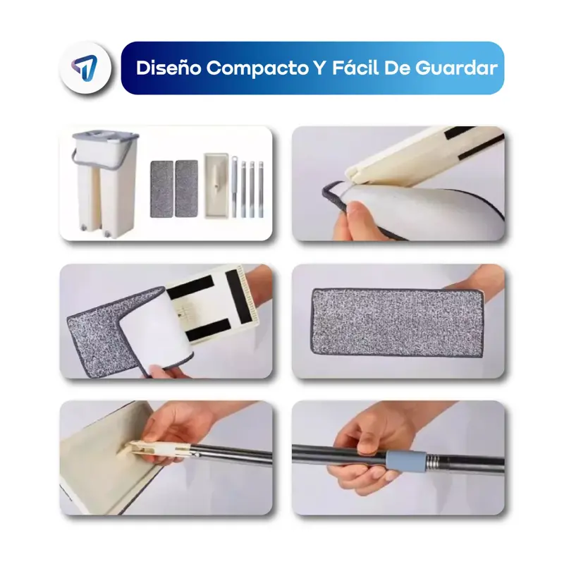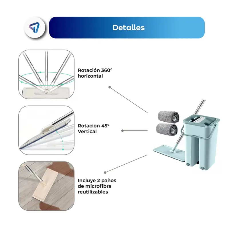 Trapeador WAGGS Todo en Uno con balde y escurridor integrado- Ideal para una limpieza práctica y sin esfuerzo. Incluye mopa plana de microfibra con cabezal giratorio 360° para alcanzar rincones y superficies difíciles. El mango de acero inoxidable es ajustable hasta 1.30 m y permite una limpieza cómoda bajo muebles. El balde resistente de 6 litros con escurridor facilita el enjuague sin ensuciarse las manos. La mopa reutilizable de 33x12 cm ofrece una gran absorción para limpieza en seco o húmedo. Incluye 1 balde, 1 mango y 2 mopas de microfibra.