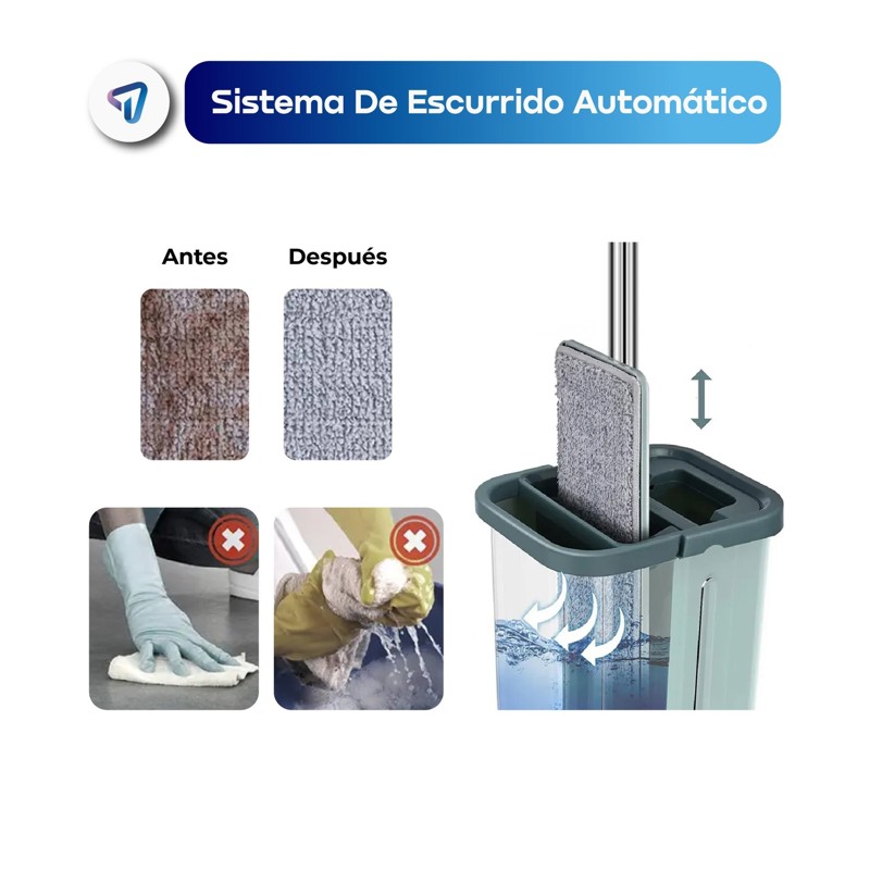 Trapeador WAGGS Todo en Uno con balde y escurridor integrado- Ideal para una limpieza práctica y sin esfuerzo. Incluye mopa plana de microfibra con cabezal giratorio 360° para alcanzar rincones y superficies difíciles. El mango de acero inoxidable es ajustable hasta 1.30 m y permite una limpieza cómoda bajo muebles. El balde resistente de 6 litros con escurridor facilita el enjuague sin ensuciarse las manos. La mopa reutilizable de 33x12 cm ofrece una gran absorción para limpieza en seco o húmedo. Incluye 1 balde, 1 mango y 2 mopas de microfibra.