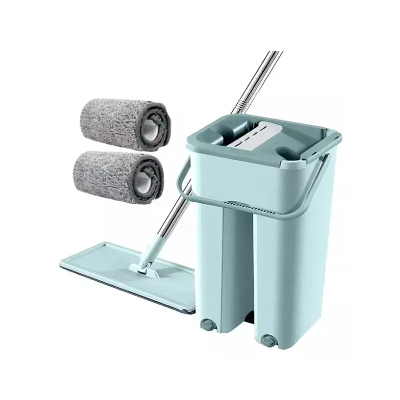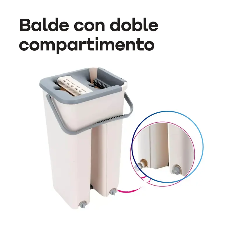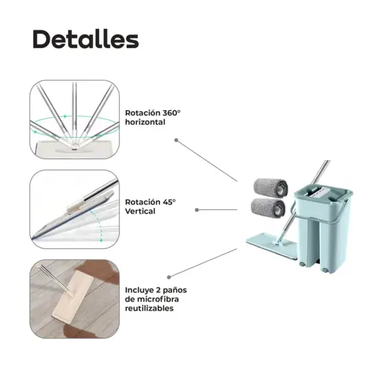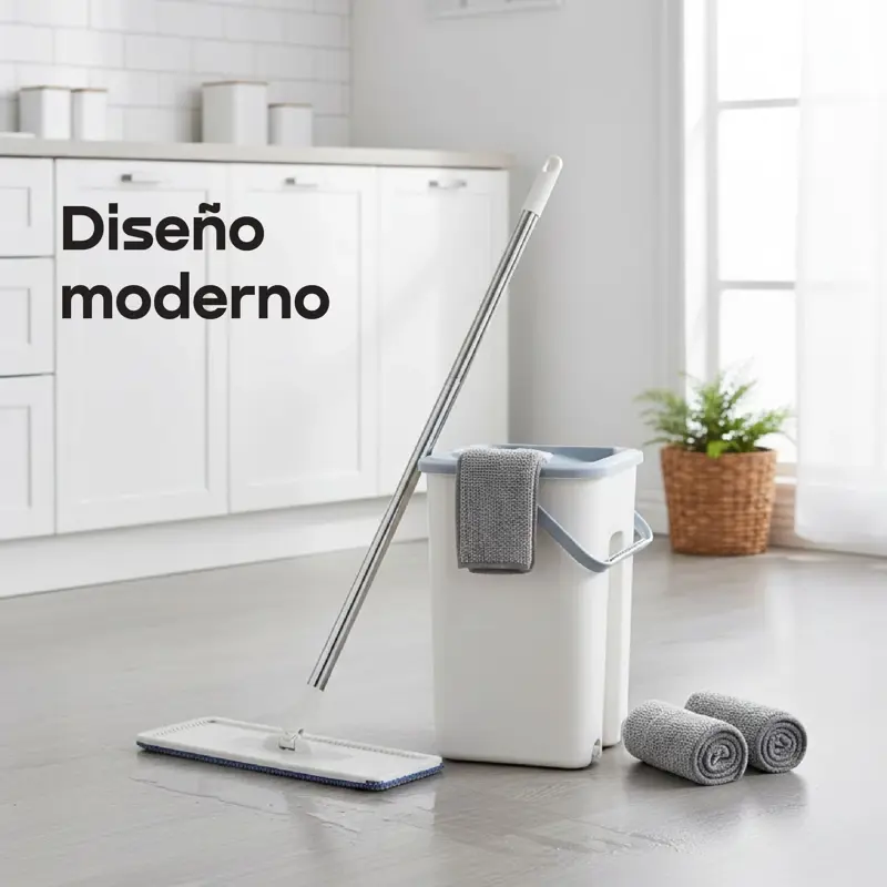 Trapeador WAGGS Todo en Uno con balde y escurridor integrado- Ideal para una limpieza práctica y sin esfuerzo. Incluye mopa plana de microfibra con cabezal giratorio 360° para alcanzar rincones y superficies difíciles. El mango de acero inoxidable es ajustable hasta 1.30 m y permite una limpieza cómoda bajo muebles. El balde resistente de 6 litros con escurridor facilita el enjuague sin ensuciarse las manos. La mopa reutilizable de 33x12 cm ofrece una gran absorción para limpieza en seco o húmedo. Incluye 1 balde, 1 mango y 2 mopas de microfibra.