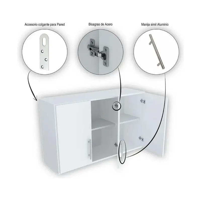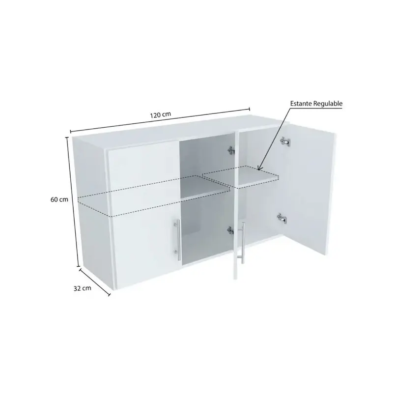 Características principales Marca: Centro Estant Modelo: AL120BL Tipo de mueble de cocina: Alacena Color: Blanco Ensamblado Requiere ensamblado: Sí Incluye manual de ensamblado: Sí Otros Modelo detallado: AL120BL Materiales del cuerpo: 15mm, Melamina Material de las correderas: Metal Material de los tiradores: Plástico Materiales de las puertas: Melamina Alto de la alacena: 60 cm Profundidad de la alacena: 32 cm Ancho de la alacena: 120 cm Ancho del bajomesada: 120 cm Cantidad de cajones: 0 Cantidad de puertas: 3 Incluye mesada: No Con estantes: Sí Estilo: Clásico
