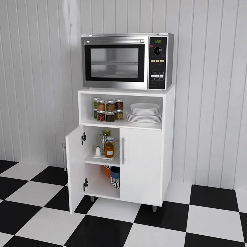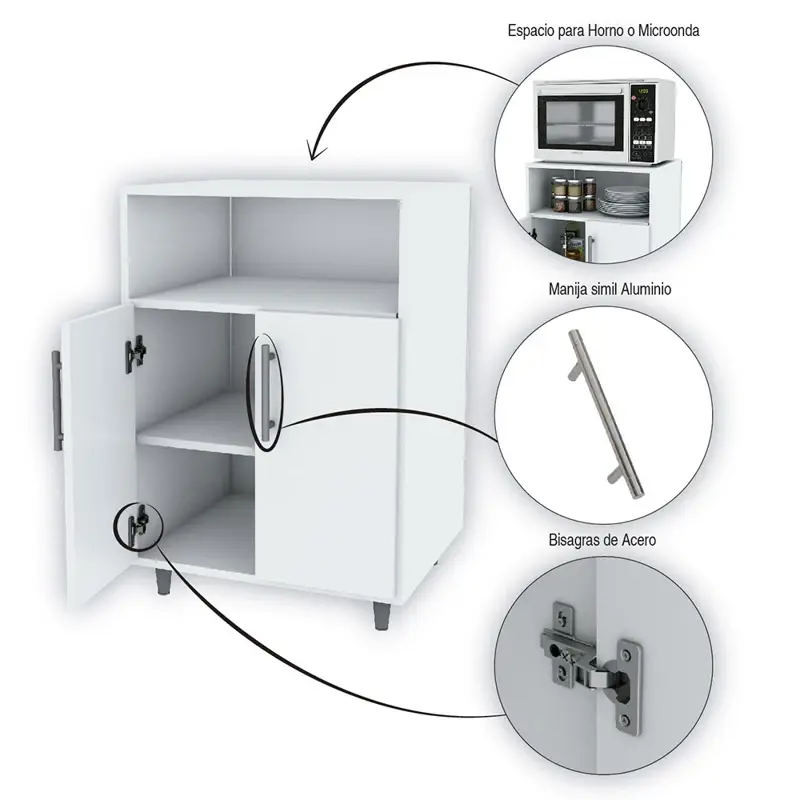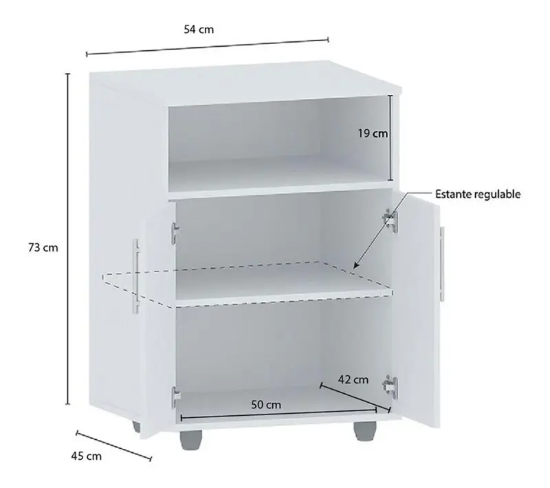 MUEBLE DE COCINA RACK MICROONDAS - Centro EstantModelo: G10BLUbica el microondas en un lugar seguro. Este organizador pretende evitar que uses la mesada para ese tipo de electrodomésticos. De esta forma, no solo volvés tu cocina más segura sino también ganás espacio de trabajo a la hora de cocinar.Este organizador cuenta con un espacios para ubicar microondas, un estante y un lugar de guardado con un estante en su interior.Características• 1 Estantes• 2 Puertas• 2 Estantes internos• Manijas aluminizadas• Bisagras reforzadas• Revestido en melamina• Medidas producto: 76 (Al) x 54 (An) x 45 cm (Prof)• Medidas embalaje: 74 (Al) x 54 (An) x 12 cm (Prof)• Peso embalaje: 20Kg