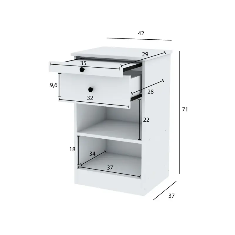 Si sos fan de desayunar en la cama esta es la mesita de luz para vos. Contiene una bandeja corrediza que podes usar para apoyar lo que necesites. Además cuenta con un cajón y un estante regulable en altura para ubicar según tus necesidades.