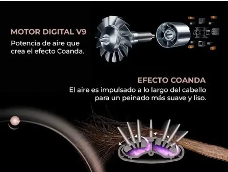 - Efecto Coanda: el aire se adhiere al cabello, envolviéndolo suavemente para lograr rizos perfectos y un alisado sin esfuerzo.